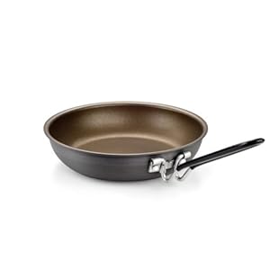 Product Description : Fry pans in 10 inch and 14 inch size are hard anodized aluminum with Teflon coatings for easy cleanup. 10 inch handle folds. Non-reactive hard anodized surface is harder than stainless steel while heating with exceptional efficiency and uniformity. Easy cleaning nonstick surface. Exclusive SureLock folding handle. Spiral-turned base grips stoves and grills securely. Weight = 17.8 oz. Dimensions = 11.1" x 10.6" x 2.8".